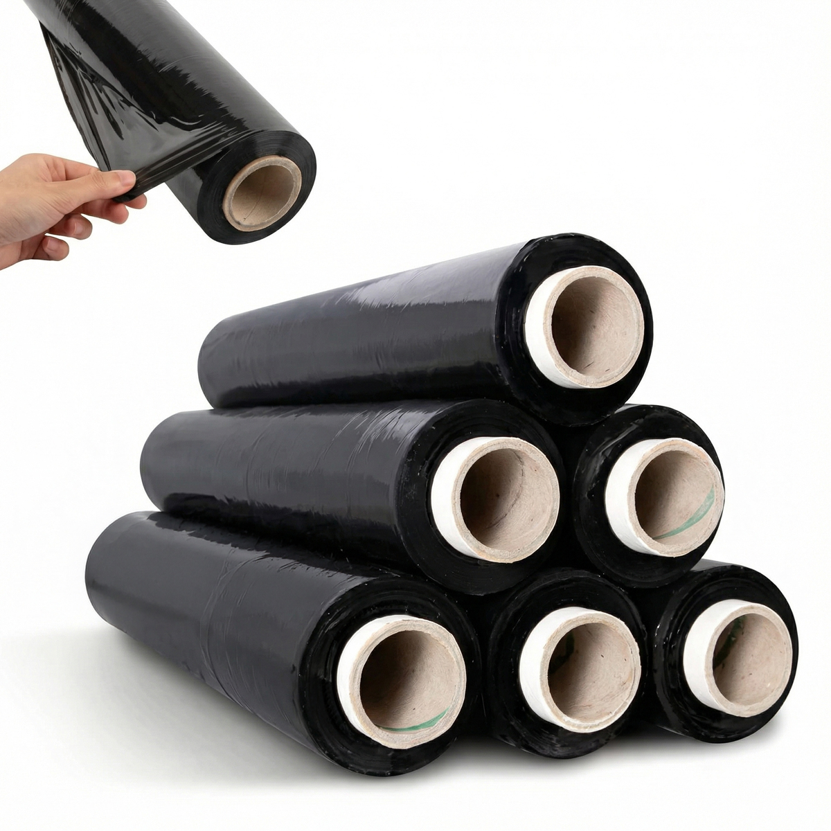 Caja con 8 rollos de film negro paletizador de 1,7 kg para protección y confidencialidad de carga.